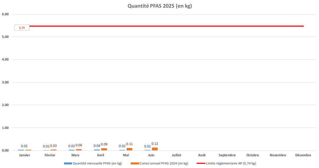Entre le 1er janvier 2025 et le 30 juin 2025, la station d’épuration collective a rejeté 4,9 Kg de PFAS.