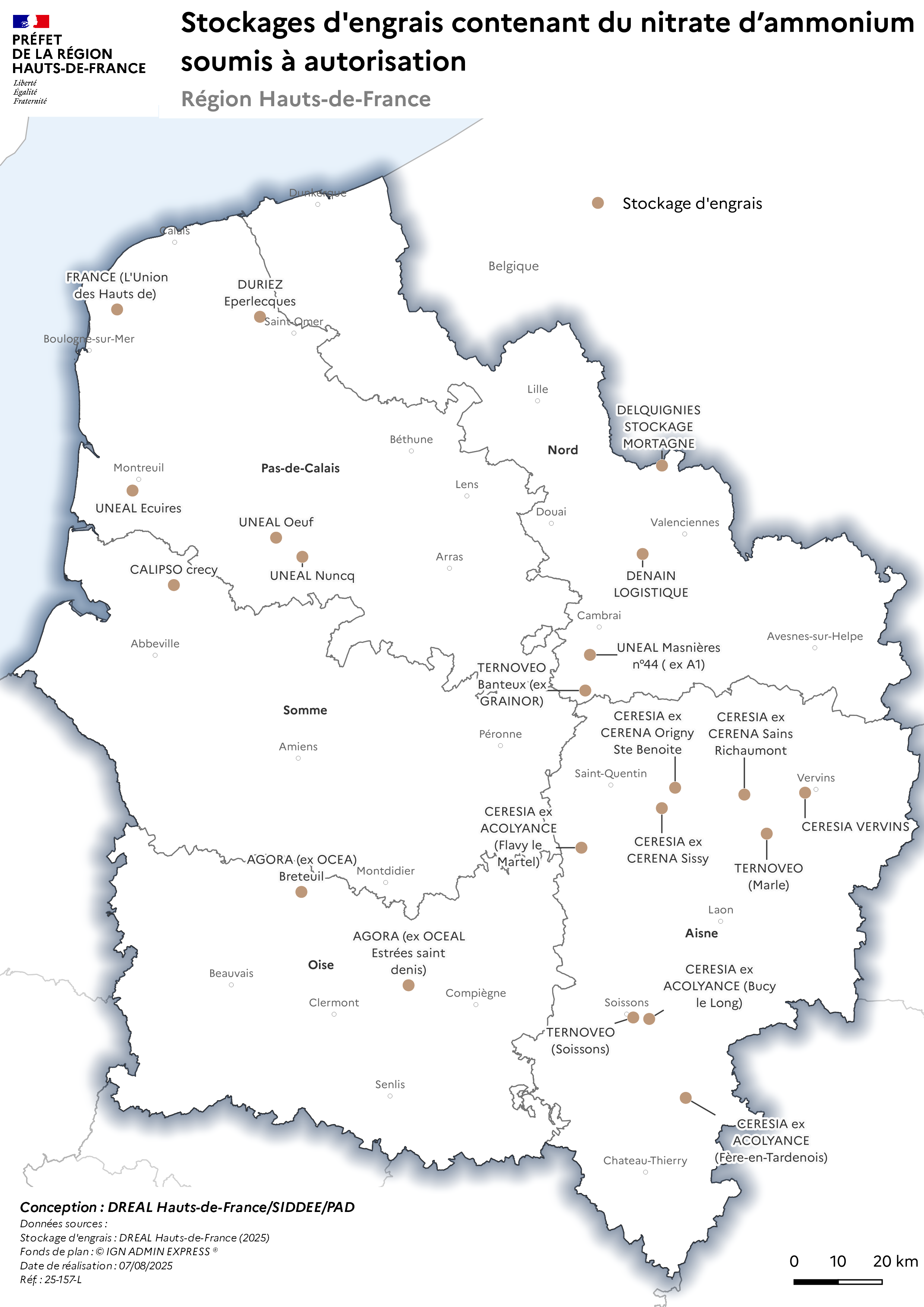 Carte stockage d’engrais contenant du nitrate d’ammonium soumis à autorisation Hauts-de-France